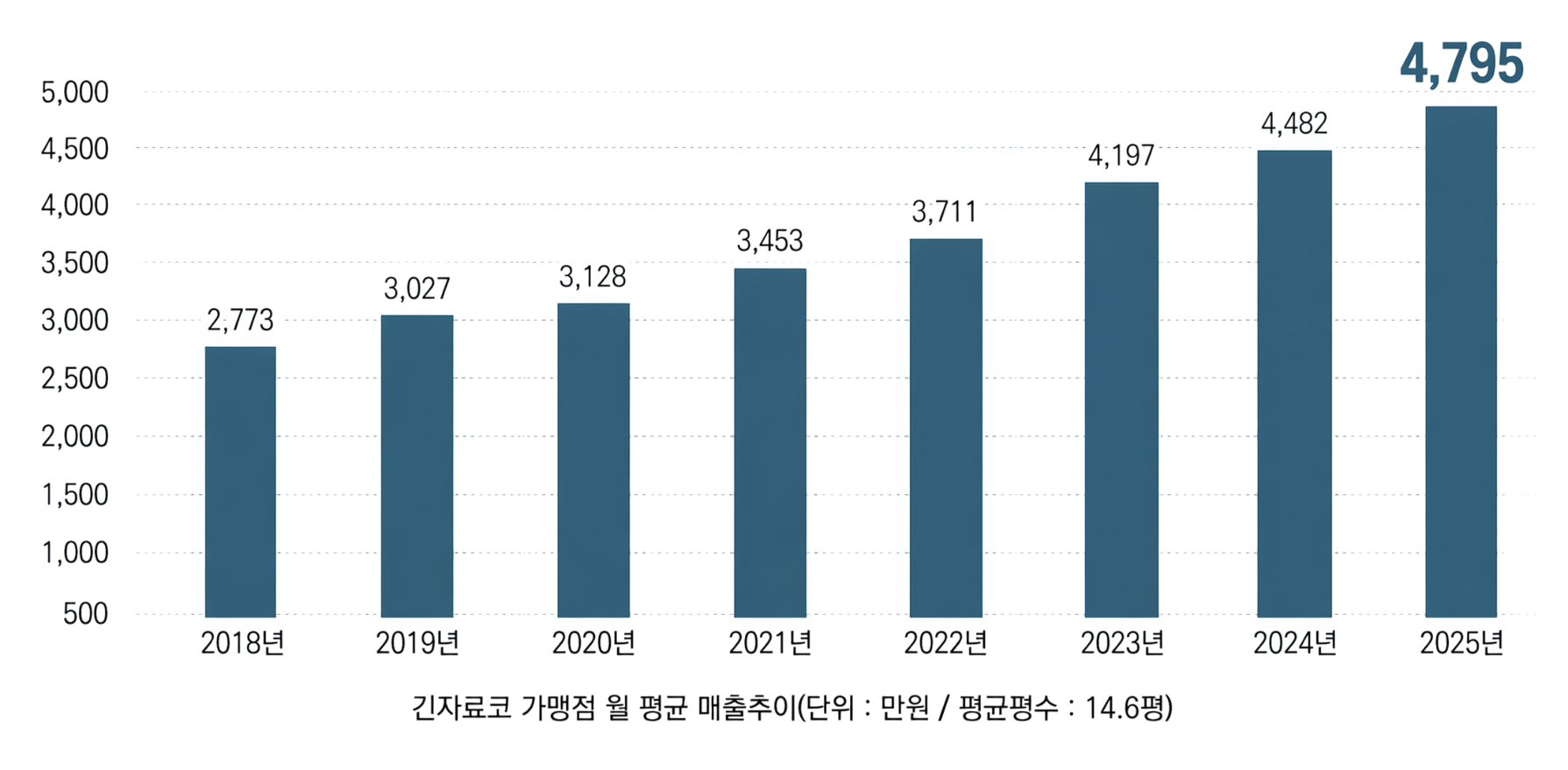 ※ 위 표는 실제 긴자료코 매장들 매출에 근거한 데이터이며, 상권 특성, 경기 변화, 평수, 점주 역량 등에 따라 변동될 수 있습니다.